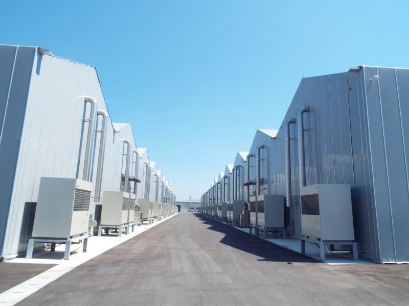 | 施設の特長など | 11連棟式2棟 菌床栽培工場 外装光遮断フィルム使用 高軒高栽培温室 |