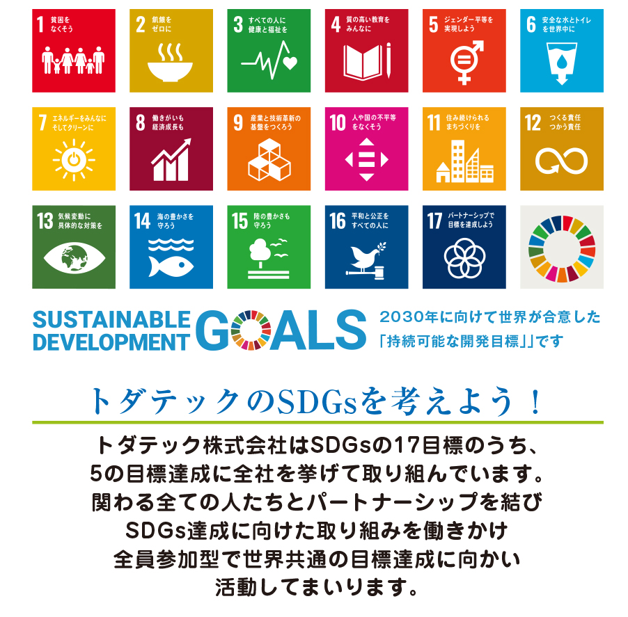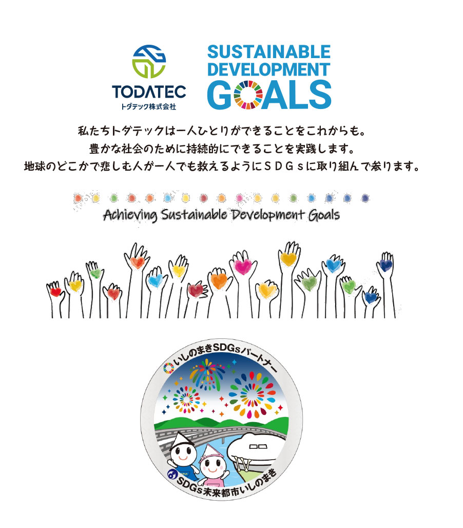 我々、トダテック株式会社は社員一人一人が本気でSDGsを企業行動につなげ、お客様や地域から信頼され、持続可能な地域社会の創造に貢献できるように尽力していきます。