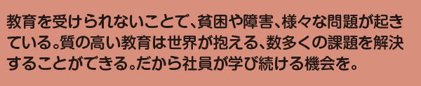同様に2019年より社員教育を行うため、Eラーニングを導入し全社員の人材育成に取り組んでいます。また社員に向けた公的資格取得のための資格取得支援を行い、個人の成長を支援する取り組みを行っています。技術・人間力向上のための教育の実施により、一人ひとりの適切な能力開発、教育訓練の機会を社員に提供することで質の高い教育の輪を広げていきます。